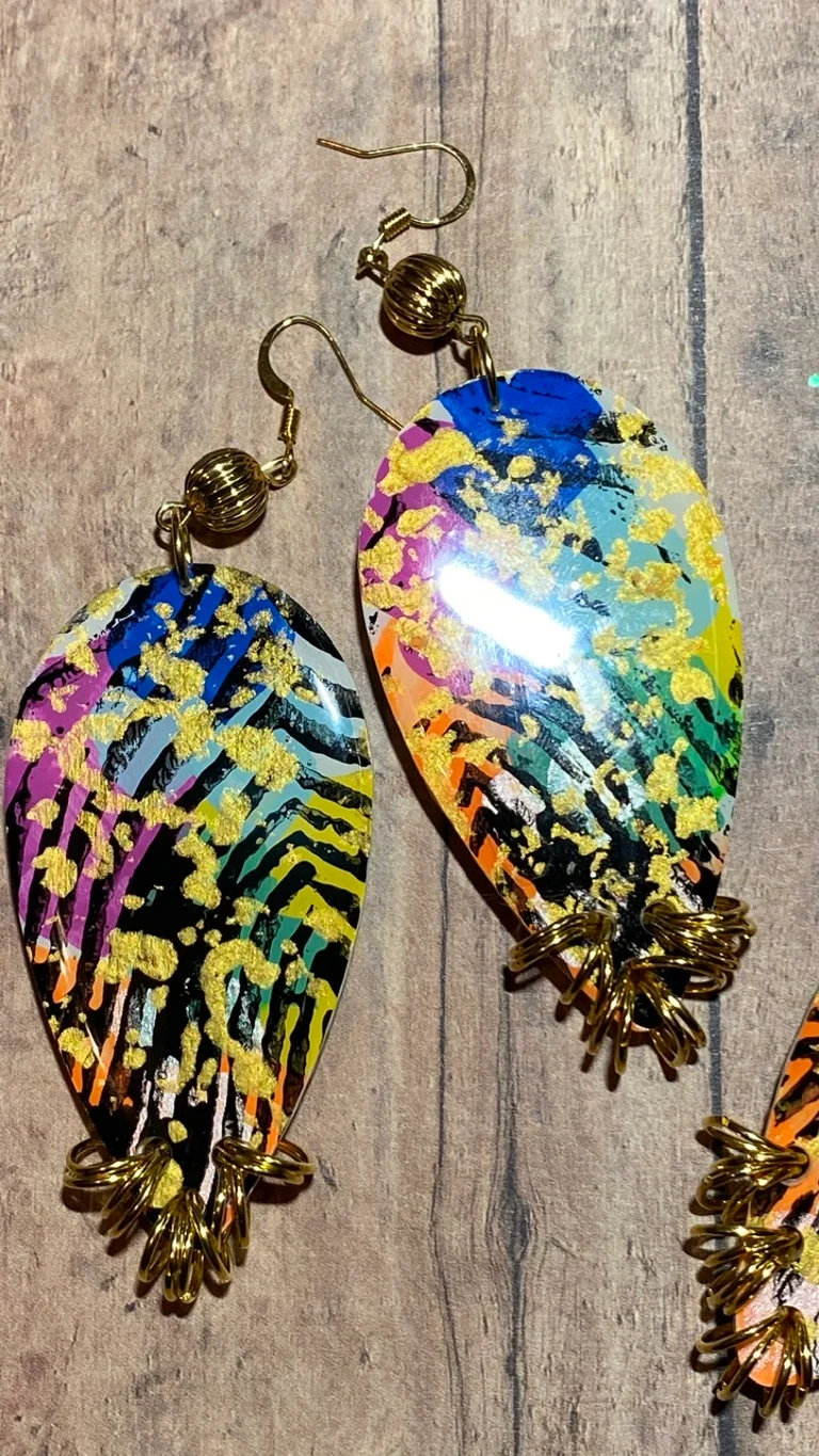 Hand painted wood w/ vibrant acrylic paint, 14k plated jump rings & Beads annnnd coated with resin for that nice and shiny glowy glow✨