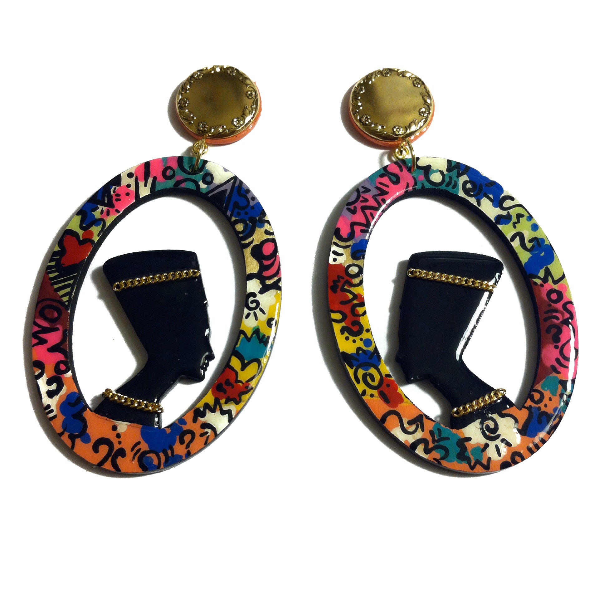 Nefertiti Wood based earrings with abstract art base. Original design inspired by Keith Haring which I made into my own.